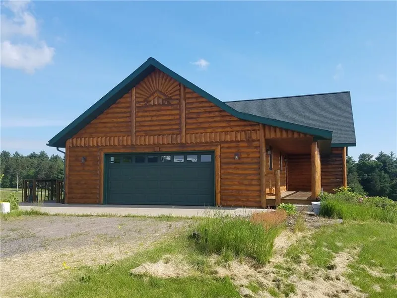 Beautiful hybrid log home w/custom oak built cabinets, garage is finished with in-floor heat (not hooked up). Entire home is hardwood or tiled floor, interior doors are 6 panel oak. Option to add a loft above bedrooms. Lower level walk-out has in-floor heat. Butler steel building is 60x100, front half is foam insulated and in-floor heat (not hooked up), the back portion is not insulated, attached office is 17x62 finished. All of this and a private pond too! One owner home, sure to delight.