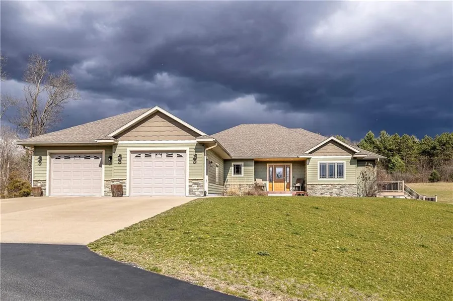 Quality home built in 2013 and sits on 5.12 Acres! Located west of Black River Falls, this beautiful home with open concept boasts 2,023 sq.ft on main floor finished walk-out basement with family room, bathroom, bedroom, bonus room plus lots of storage. Enjoy 4 bedrooms, 3.5 bathrooms, hickory & tile flooring, cherry cabinets, and kitchen appliances plus a 7' x 8' walk-in pantry. Stay cozy with geothermal heating & in-floor heat in basement. Attached 2-car garage, smart siding with 50-year warranty, heated & insulated pole shed, and garden shed complete the package. Don't miss out on this quality-built home! Bull-nose corners. Private deck. Septic was installed for a 3 bedroom home. Pre-Home Inspection was done.