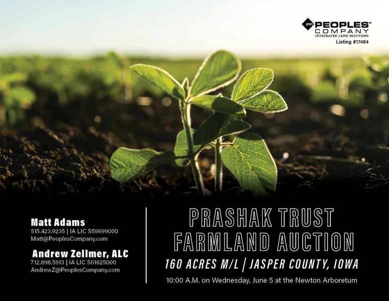 Jasper County, Iowa Farmland Auction Mark your calendar for Wednesday, June 5th, 2024 at 10:00 AM! Peoples Company is pleased to represent the Darlene M. Prashak Trust in the sale of 160 total acres m/l of prime Jasper County, Iowa farmland. The farm came under family ownership in the early 1930s and is currently owned by 3rd generation family members, which means the farm will be available for sale to the public for the first time in nearly 100 years.