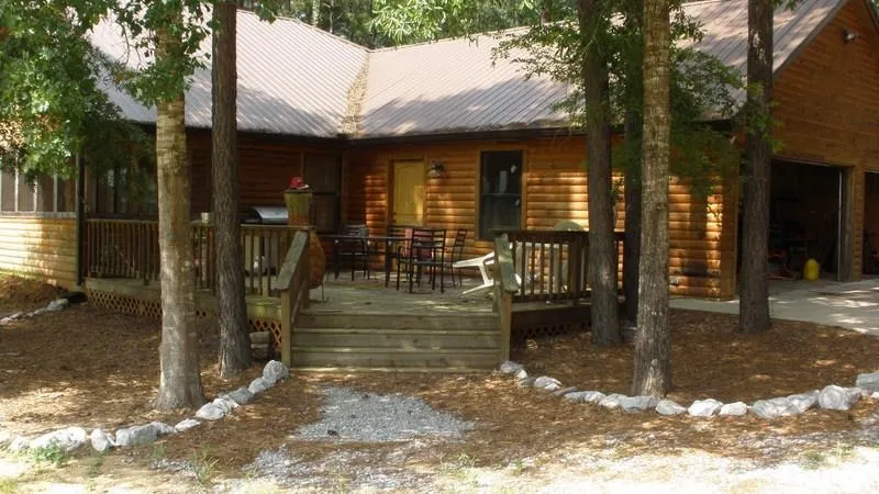 Beautiful log home with open greatroom, handcrafted beams, slate gas burning fireplace, large master suite with oversized shower. Two guest rooms with Jacuzzi in guest bathroom. 3 car enclosed garage, outside patio dining and screened in porch. Over 128ft of waterfrontage on the main lake. Property also comes with guest/boathouse. Built handicap friendly. See video for other unique features of this home.