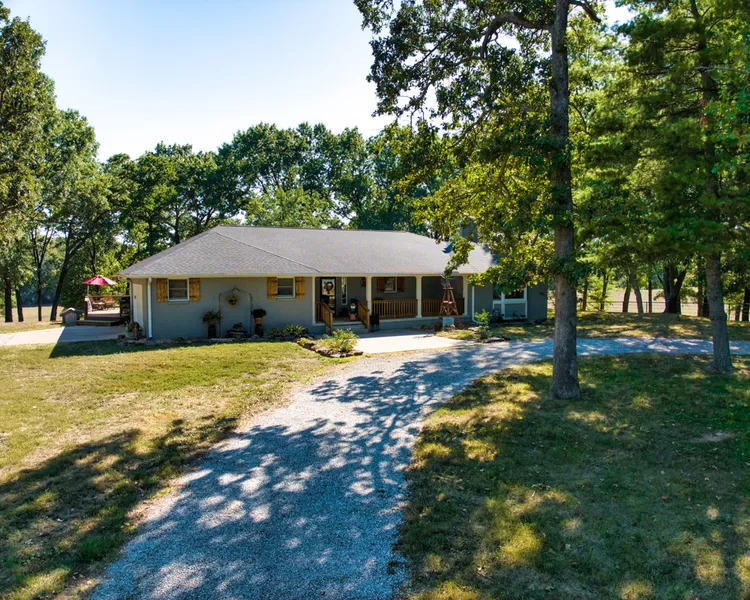 Nestled within a sprawling 112 +/- acres of mixed pasture and mature timber, a remarkable residence stands, embodying both elegance and functionality. This newly remodeled 3,800 square-foot home features four spacious bedrooms, an office, and three meticulously updated bathrooms, all adorned with exquisite hickory hardwood floors that grace the upper level. The property boasts a two-car attached garage, complemented by a three-car detached garage, catering to both leisure and utility.
