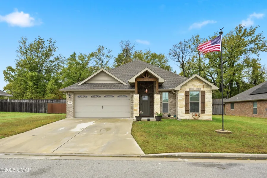 Welcome to Anderson Estates - Where Style, Space, and Serenity Meet Discover this nearly new 3-bedroom, 2-bath home tucked within one of Webb City's most sought-after neighborhoods - Anderson Estates, a community known for its welcoming atmosphere and beautifully maintained surroundings. Perfectly positioned on a generous size lot, this property offers exceptional breathing room between neighbors and a tranquil backdrop of mature trees that provide both privacy and natural beauty. From the moment you arrive, the home's striking combination of stone, brick, and warm wood accents commands attention and sets the tone for what's inside. Step through the front door into 1,825 sq ft of beautifully designed living space, featuring an open-concept layout highlighted by soaring 10-foot ceilings and new premium laminate flooring throughout. The spacious family room flows seamlessly into the gourmet kitchen - complete with custom cabinetry, luxurious granite countertops, stainless steel appliances (including a gas range and side-by-side refrigerator), and an inviting eat-in bar. The adjoining dining area offers a comfortable place to gather while enjoying peaceful views of the backyard. The primary suite is a retreat of its own, featuring a raised ceiling, dual vanities, a relaxing garden tub, a separate walk-in shower, and a generous walk-in closet. Two additional bedrooms share a beautifully appointed guest bath, offering plenty of comfort for family or guests. Outside, unwind on the large covered patio overlooking a fully fenced backyard framed by lush greenery - the perfect setting for morning coffee or evening get-togethers. Zero grade accessibility at all entrances. Located just minutes from Webb City schools, shopping, dining, and scenic walking and bike trails, this home combines luxury, comfort, and community living in one irresistible package.