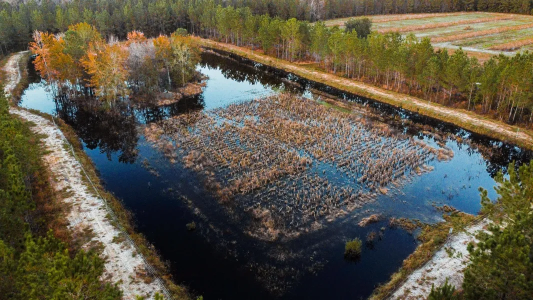 Turkey Pines is a special place for wildlife and feels much larger than its actual size, thanks to its diverse habitat. The property offers excellent quail opportunities in the front left section, where a 20-acre mature pine stand transitions into a 10-acre field that could be planted for birds and other wildlife to forage. The top section of the first field borders the duck impoundment, which is fed by a well and includes roughly 2 acres of tillable land, while the entire impoundment spans 3.5 acres. The owners recently had the dike re-graded and repacked.