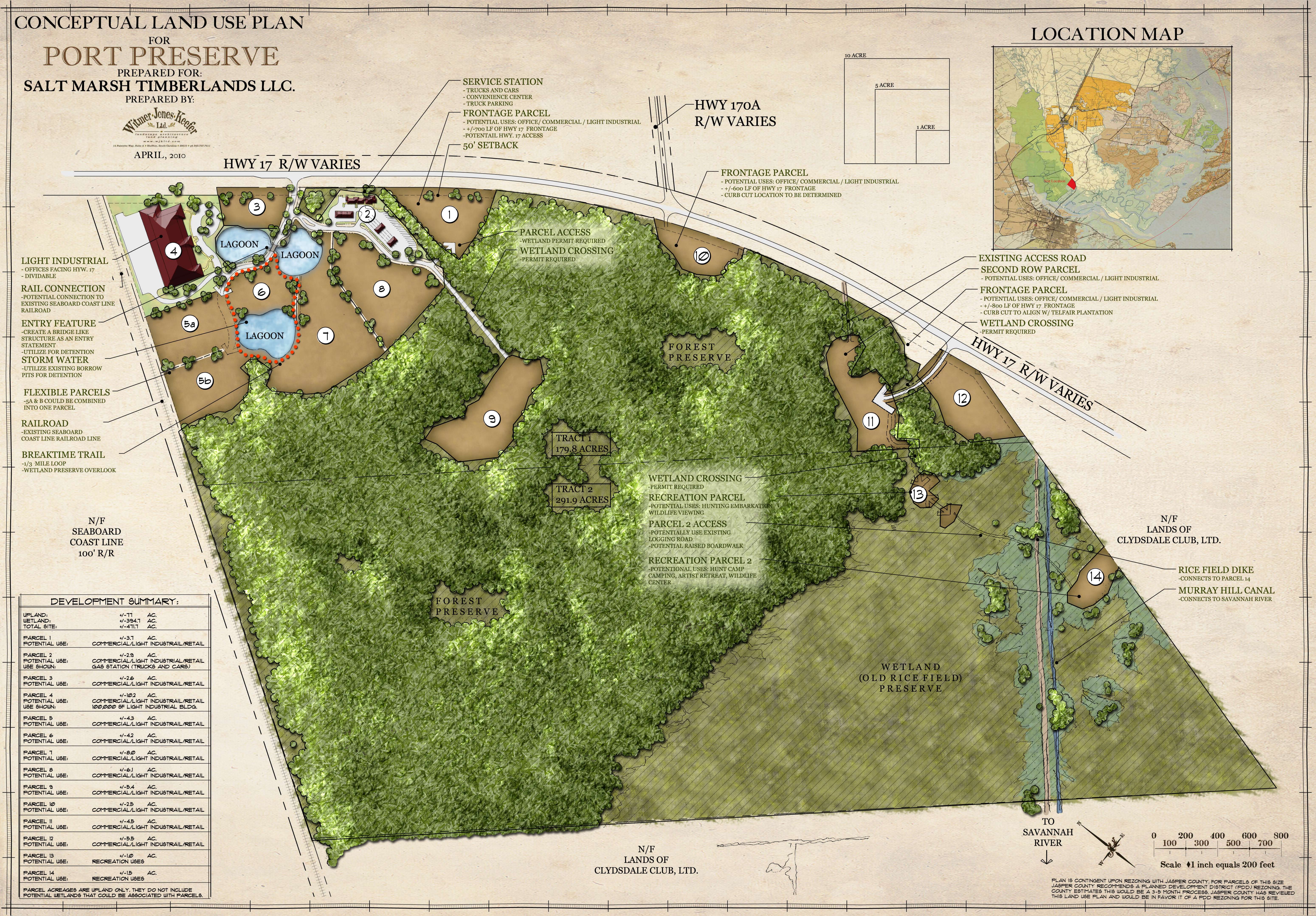 Port Preserve is located along Highway 17 in Jasper County, South Carolina. It is a quick five miles from the heart of downtown Savannah, Georgia and only 13 miles from Bluffton, South Carolina. The total acreage is 472 with 77 acres being usable upland, mostly covered in pine. Three lagoons are situated on the upland acreage and an existing seaboard coast line railroad borders the property on the west.