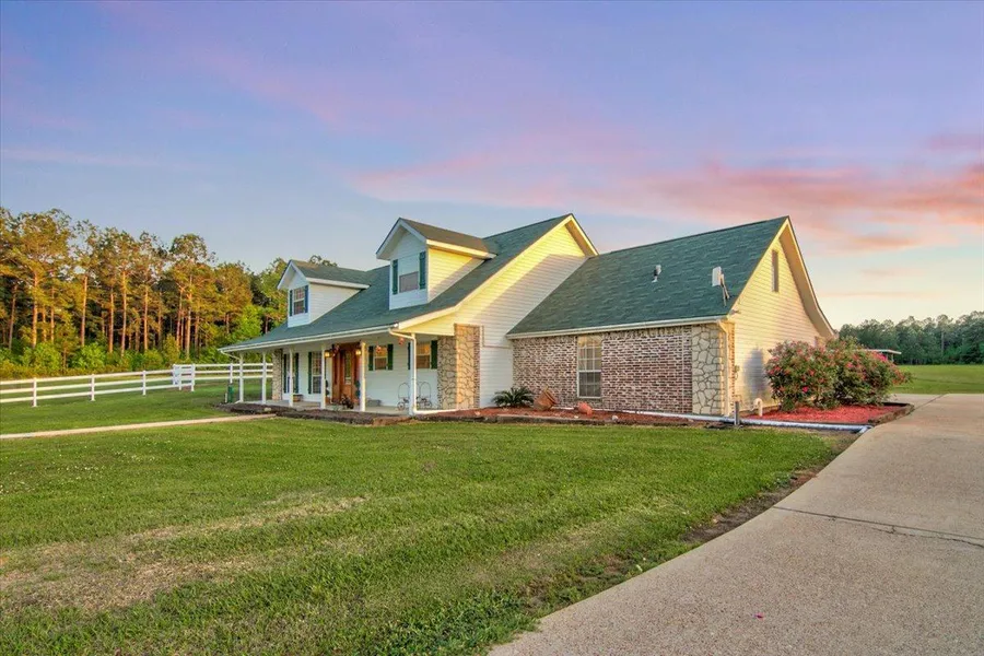 Custom, rustic home built in 2009 with 2528+ sqft on 21 acres of gorgeous rolling, fenced and cross pasture. The home features trimmed Coronado Stone outside and in, wood burning fireplace, movie theatre viewing in living, two guest bedrooms with jack-n-jill bath, open living, kitchen, dining foyers downstairs. Oversized primary suite upstairs. Two car garage with 1/2 bath and 12x22 attic. The land features gorgeous gently rolling terrain, a pond and is surrounded by timber on three sides; gated entry with paved driveway and heavy duty paved entry into the pasture. The property also features an LED lit 1764sqft patio perfect for entertaining with a fire pit, 16x32ft pool and 462sqft deck & extra 940sqft patio, decorative fountains, outdoor kitchen area, Outdoor shower,12x42ft veranda. 14x20ft bonus building w/AC, 20x26ft shop, Barn Master Stables w/ paddock awnings, 3-Bar white fencing. ...