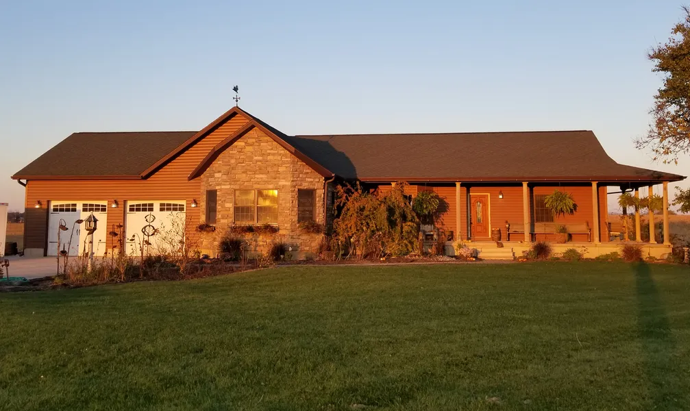 Extremely nice, hard to find, ranch home in the country with full walk out basement. This exceptional home has beautiful Brazilian Cherry hardwood floors, custom Hilty kitchen with solid surface counter tops, huge island, stainless steel refrigerator and range with double oven, two sinks, breakfast bar, and spacious dining area with bay window. Fantastic views of the surrounding with balcony and wall of windows overlooking the living and rec rooms in the walk out basement. Huge master suite with well appointed master bath boasting two person jetted garden tub, separate walk in tiled shower and large walk in closet. Two main floor bedrooms and a bathroom. Full basement offers a large living room and rec room area with patio doors that walk out onto the paver patio, kitchenette, music/theater room with sound proofing, surround sound and projection, an additional large, finished room and a half bath. Electric heat pump with gas furnace back up and central air. Heating system has extra filtering system for allergens. Unfinished storage room has second basement access stairs. Deep attached two car garage and landscape irrigation. All sitting on two acres in the Northern part of Jay County.