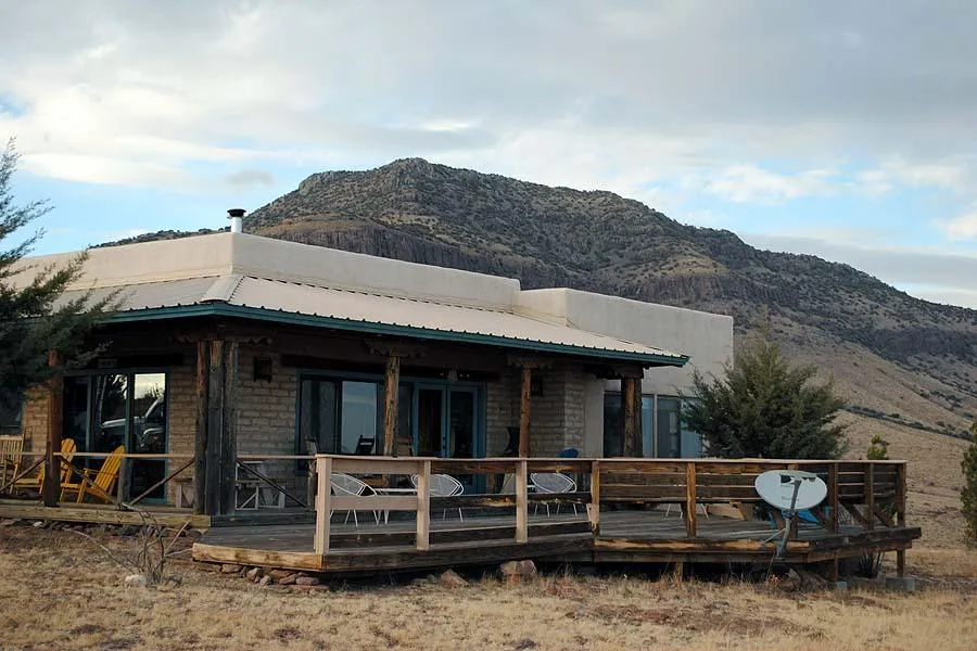 Exquisite Davis Mountains home on 30.02 acres atop the foothills of Blue Mountain (in the background). The home, built by Rainbow Adobe of Alpine, Texas, is made of stucco over stabilized adobe block, and includes many finely crafted, custom finishes that are the specialty of this fine builder. The interior has 6X8 rough sawn pine beams and diagonally placed ceiling boards, hand-made cabinets and built-ins throughout the home. A wood-burning stove provides plenty of warmth on cool days. Floors are made from paver bricks set in sand in the main house and bedrooms, and Saltillo tile in the kitchen. This two-bedroom, 1.75 bath home has covered porches on two sides, with a large deck off the eastern side, with views of the Puertacitas, Haystack and Mano Prieto Mountains. The covered porches have built-in benches, and are traditional Rainbow Adobe style with hand-peeled vigas (posts) and h...