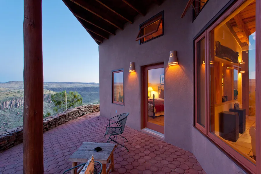 This beautiful casita is situated on the very top of Scobee Mountain overlooking Fort Davis, Texas, at 5,420 feet in altitude. Designed by a local architect famous for his quality, this elegant home has a roof shaped like the wings of an eagle, a back patio with breathtaking views, and a deck with true 360-degree views ranging from a 30-mile north view to a 90-mile view to the south.