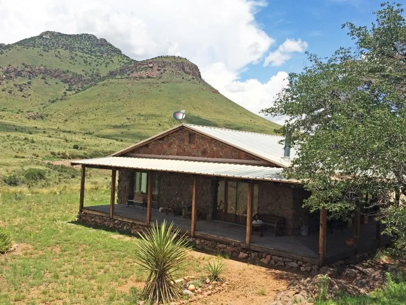 Set your sights on this rustic and charming cabin located on nearly 25 acres on Blue Mountain Trail! Picture perfect views in all directions, two sided covered porch, amazing rock formations, mature oak trees, and situated on the top of a hill overlooking the valleys and hills below. Blue Mountain is in the near distance providing a fantastic view and setting. The home has custom rock exterior, metal roof, and shared water well. A large living room and kitchen with vaulted ceilings and Saltillo tile welcome you into the home. A woodburning stove is nestled in the corner of the living room but the house is also heated with central electric heat. Exposed wood beams and pine ceiling add warmth and character to the home. All trim and interior doors are stained pine. The kitchen has plenty of space for a formal dining table and offers custom wood cabinets and tiled counter tops, built-in shelves and wine rack, electric stove, dishwasher, & refrigerator. A huge utility room is situated between kitchen and garage with built-in shelves and desk, washer & dryer, and plenty of storage space. The garage has two automatic doors and great work space. The master suite includes large closet and private bathroom with large vanity, wood ceiling, and tiled bath/shower. The guest bedroom is large enough for a full size bed and bunk beds and has a deep closet. The guest bathroom has a tiled tub/shower and large vanity. The location is one-of-a-kind and breathtaking. Must see to appreciate! Call for an appointment today.