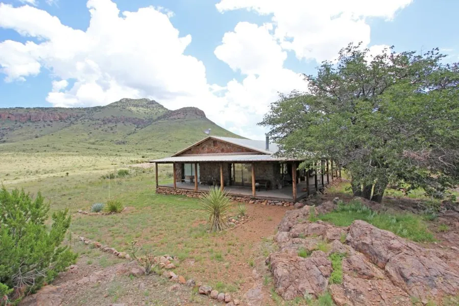 Extraordinary vistas abound from this mountain retreat with two bedrooms, two baths, and 360 degree views of the Davis, Haystack and Puertacitas Mountains. Located on 24.98 fenced acres on a hill adjacent to Blue Mountain, this 1296 sq. ft. home is surrounded by volcanic rock formations, pinion pines, and mature oak trees. This one-of-a kind home has a rock exterior, two-sided covered porch, metal roof and a shared well. There is Saltillo tile flooring throughout as well as vaulted pine ceilings. The kitchen countertops are made of Mexican tiles that complement the hand crafted cabinets. The comfortable dining area provides for transition to the open and spacious living area with wood burning stove. Large fixed windows allow for plenty of natural light and unobstructed views. Located off of the kitchen, a shelf-lined twenty-two foot long bonus room serves as both an office space and utility room and pantry. The large master suite has ample room for a sitting area and includes a private bathroom with Italian marble vanity and bath/shower and large closet. The guest bedroom can accommodate a full size bed AND bunk beds and has private access to a shared hall bathroom with Italian marble tiled tub/shower and double vanity. The over-sized two car garage has automatic doors and workshop space. The home has central heat and air conditioning and a heat pump. Sellers are licensed to sell real estate in the State of Texas. Call for an appointment today to see this unique custom built mountain retreat!