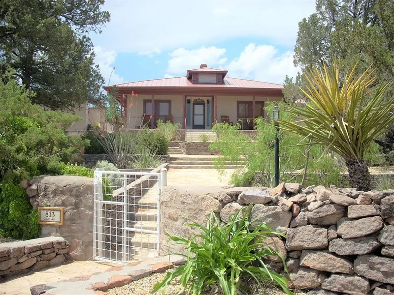 Located on 9.24 acres in Fort Davis, Texas this historic Court Avenue adobe house and its guest house are a piece of heaven in the West Texas Davis Mountains. The houses are nestled in huge natural boulders on the south slope of Sleeping Lion Mountain. Today, 813 Court Avenue has been completely renovated for modern living. The house has two bedrooms, a study and one-and one-half baths. The 2,050+/- square foot adobe home retains the charm of its 1914 construction. Period architectural details abound including; 10 foot ceilings, encased hardwood windows and arched doors, rock fireplace, tile flooring through-out, built-in closets, shelves and cabinets, and abundant storage room. Updates to the home include updated plumbing, electric, roof, charming kitchen, laundry area, skylight, and back deck. There are many intimate sitting and lounging patios, porches and outdoor dining a...