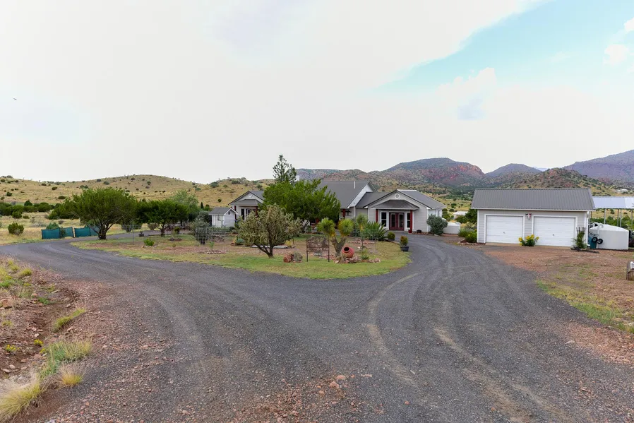 Research Parcel InformationAn oasis in the desert, this elegant ranch style three bedroom, three bath home with covered front and rear porches are accented by fruit trees, native and desert plant gardens, with views looking out to Brown and Paradise Mountains. The 25 acre property features a 1,000 square foot barn, tack room, 15,400 square foot arena, 'round pen', chicken pen and coop and over 11,000 gallons of rainwater/dew water catchment in addition to a private well. Dutch barn workshop and exercise garage.