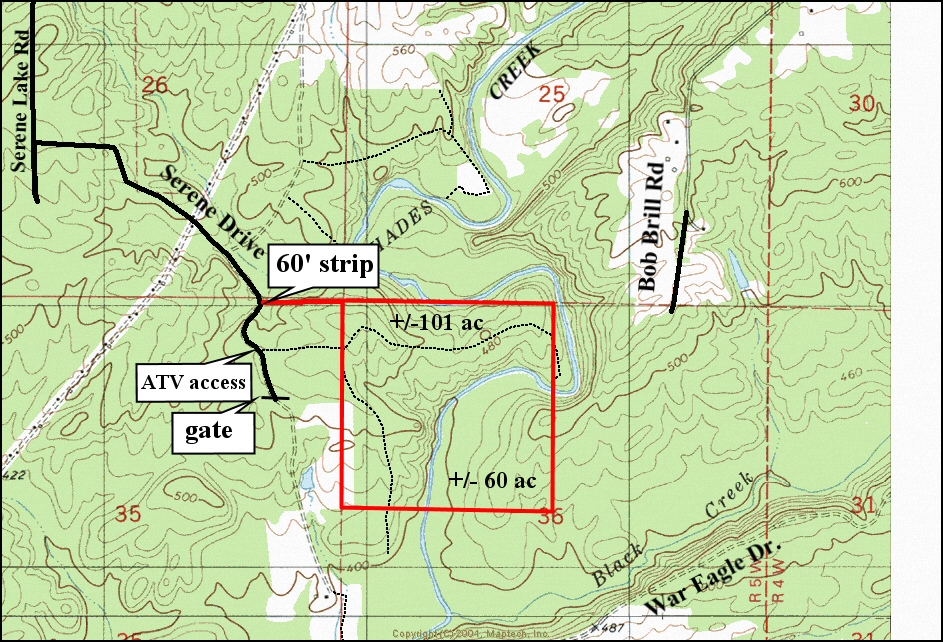 A 60 wide strip gives 101 acres access to a well maintained semi-private road; power available