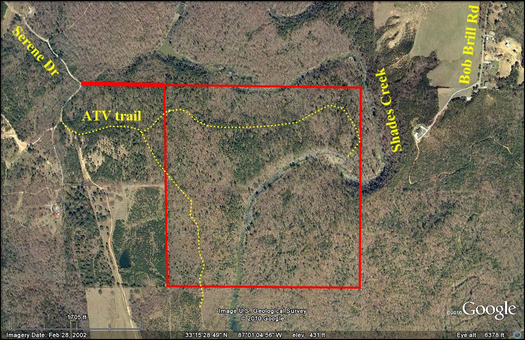 Research Parcel InformationFrom I-459 Exit #1 (Eastern Valley Road), head southwest on Eastern Valley Road and go about 400 feet and take first left on Bell Hill Road. Go 1.0 miles to Lou George Loop and take a right. Continue for 2.8 miles to Fletcher Road and take a right. Continue 1.6 miles and bear to the right onto Lynne Drive. Continue on Lynne for 3/10 of a mile and merge onto Serene Lake Road. Continue 9/10 of a mile and turn left onto Serene Drive. Continue 8/10 of a mile to the large Cyprus Partners Sign on the left. This is the point where the 60 wide strip of land touches Serene Drive. The 4-wheeler ATV access trail is a few hundred feet further on the left. Look for the trailer on the left and a small Cyprus Partners sign pointing to the access trail.