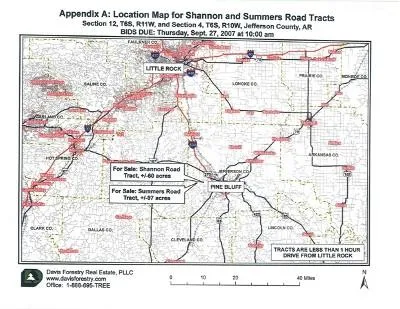 SEALED BIDS DUE 9-27-07 AT 10:00AM. TO RECEIVE A BID PROSPECTUS CALL OR EMAIL DFRE, PLLC OR SELECT 'CONTACT FOR MORE INFO' LINK ABOVE LOCATION MAP AND SEND US A REQUEST THROUGH THE WEBSITE. Shannon Road Tract: An investment grade, well stocked, 13-year-old pine plantation makes up +/-48 acres of this +/-60-acre tract. This plantation has not been thinned. The remainder of the tract consists of natural pine and hardwood. The buyer of the Shannon Road Tract will be granted a 60-foot easement to the tract from Shannon Road, through the existing woods road. A steel gate protects tract access. The approximate locations of the easement and gate are indicated on Appendix B. To access the property, take Petty Road north from Lee Springs Road, just west of Sulphur Springs. Petty Road becomes Shannon Road. Turn left (north) on Donnie Road and follow the woods road and pink flagging to the property. The tract’s western, northern, and eastern boundaries are marked with red paint. The approximate location of the southern boundary line is marked with pink flagging. Summers Road Tract: This tract offers +/-97 acres of timberland investment and rural real estate development opportunity. There is access to electricity in the area, and a public waterline is nearby. Investment grade, well stocked, pre-merchantable pine plantations make up +/-62 acres of the property. A well stocked 19-year-old pine plantation accounts for +/-6 acres of the tract. This stand has been partially thinned and contains approximately 413 tons of pine pulpwood. The majority of the merchantable timber on the tract is located on the +/-29-acre natural pine and hardwood stand. Timber volumes and stand tables are available in the bid prospectus. The diverse cover type and abundant wildlife in the area make this an excellent hunting property. To access the Summers Road Tract, take Summers Road South off of Princeton Pike for roughly one mile. The tract lies north of Summers Road, with roughly ½ mile of frontage on Summers Road. The entrance and the estimated boundary lines of the property are marked with Davis Forestry Real Estate, PLLC signs and pink flagging.