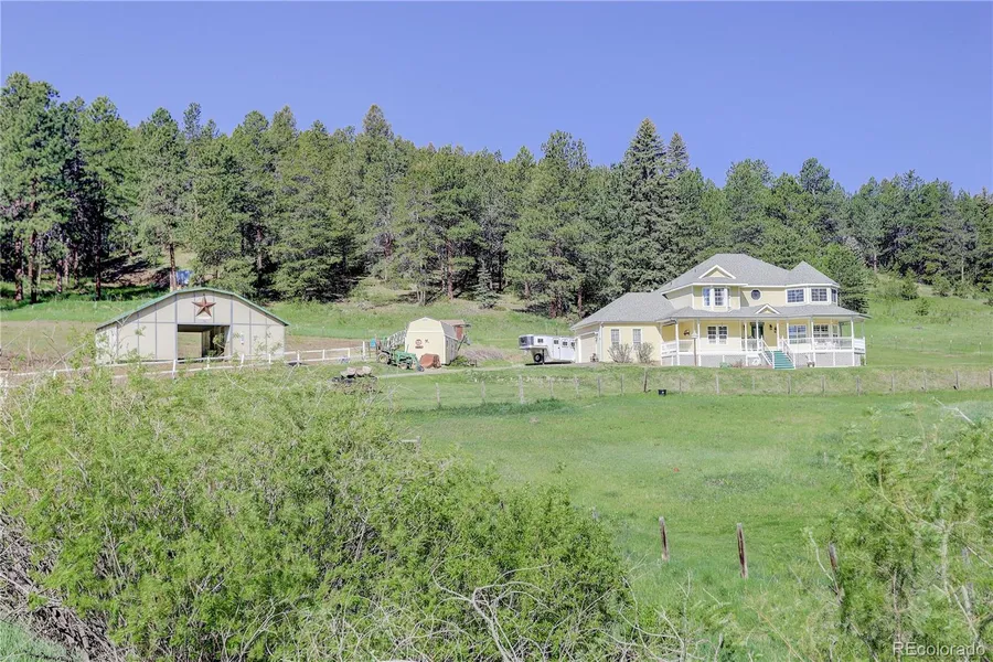 One of a Kind Distinctive Home and Horse Property!This beautiful residence and horse property are situated in a gorgeous secluded valley just minutes away from Conifer. From the prominent covered wrap-around porch to the green pastures, this is truly a standout property. The entry way features a beautiful staircase and French doors on either side. Custom interior selections are featured throughout including stunning hardwood flooring. The living room features wraparound windows and a gas fireplace. A large study is adjacent to the huge open kitchen/dining area including another cozy gas fireplace with built in cabinetry on either side. The kitchen features top-quality appliances including a double oven and notable farm style sink. Upstairs the landing/sitting area showcases a large stain glass window. Three bedrooms plus the bright and airy master suite with lots of windows, a fireplace and large 5-piece master bath. Unique chandeliers are showcased throughout the exceptional home. Interior walls are insulated for temperature and sound efficiency. An attached over sized garage completes this extraordinary residence. Home Warranty is included. Seller is very motivated.The Barn Master built three-stall barn includes a tack room and hay storage. Adjacent to corral area is a large storage shed with extra loft space and a playhouse. Property is a short ride to numerous horseback riding trails. Also includes RV Dump access.This is your opportunity to own your own outstanding piece of horse property paradise!