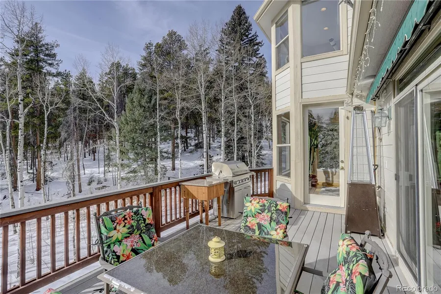 First time on market since construction in 1998. Beautiful custom home in idyllic setting nestled on 14.35 acres ofi aspens, pines and rock outcroppings. Crushed asphalt driveway, stamped concrete and trex decking, Massive Oak door leads you into soaring entry with spiral staircase. Flooded with sunlight, this home has it all; central vacuum, laundry chute, speaker system, dual hot water heaters, three-car garage with coated flooring. Hardwood floors grace the dining and kitchen areas with cupboards galore, pantry, wine rack and chiller. Lovely deck looks toward the mountains and aspens and has propane line to connect your grill. The upper level master suite has private deck, fireplace, 5-piece bath and walk in closet. Upper level office could double as nursery. Lower daylight basement accesses stamped concrete patio and hot tub. There's a dog run for your pups, trails, a flagpole and basketball stand and hoop. A slice of heaven located in close-in Conifer. Just minutes to shopping, open space parks and RTD. A rare opportunity awaits.