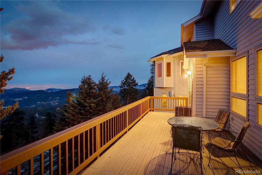 Views, Views, Views!!! Breathtaking mountain & city lights views welcome you to this private, mountain property. Vaulted ceilings on the main floor with ample windows make this open floor plan light & bright. Large front deck maximizes the outdoor Colorado mountain lifestyle. The spacious kitchen features wood cabinets, granite counters, tile backsplash, stainless steel appliances & breakfast bar. Newer refrigerator included. The adjoining dining room opens onto a convenient rear patio perfect for barbeques with family & friends. The spacious family room showcases a stately stone wood burning fireplace with wall to wall windows to enjoy the gorgeous views. The generous master bedroom suite is privately situated on the upper level offers stunning views, vaulted ceilings & a private patio. The master en suite 5 piece bathroom offers a walk-in closet & a jet action tub. There are two additi...