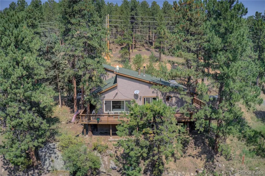 Perfect mountain location! Peaceful mountain living close to 285 for ultimate convenience & accessibility. Beautifully upgraded, move-in ready, private home. The open main floor is light & bright with ample windows & beautiful wood laminate flooring. Relax & entertain family & friends on the wrap around deck while enjoying the outdoor mountain lifestyle. The charming, updated kitchen features beautiful dark wood cabinets, neutral granite counters, stainless steel appliances, new range & center island (refrigerator & microwave included). The adjoining living room (currently used as the dining room) showcases a stately rock pellet stove & offers sliding glass doors opening onto the deck. The attached sun room features an amazing wall of windows to immerse yourself in the spectacular views of the mountains & abundant wildlife. The dining area is located off the kitchen & living rooms. The highly desirable spacious main floor master bedroom suite has remodeled bathroom with dual sinks & heated floors, wood fireplace, ceiling fan & sliding glass door onto deck. The additional flexible loft area can be used as an office, craft room or reading nook. A hot tub room or greenhouse with skylights completes this unique master retreat. The two additional bedrooms are separately located on the upper levels for maximum privacy. The finished walk-out basement with sliding glass doors & pellet stove offers a versatile bonus space for office, family room, media room, gym, man cave or game area. Newer windows, newer furnace, forced air heat & lots of storage. Newer washer & electric dryer included. Direct access 2 car garage with new door. Enjoy mountain living on over 1 acre of land with newly paved driveway, ample parking & storage shed. Plenty of room for RV, boat & all your mountain toys. A quick 30 minute drive to Denver, 1 hour to airport & 1 hour to ski resort. Close proximity to 285, supermarkets, restaurants, trails & top rated schools. Welcome to your perfect mountain home!