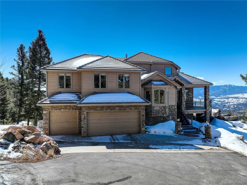 This view must be experienced, no words or photos are adequate. Mere dimensions are dwarfed by this setting, spectacular Pike's Peak is south. As your horizon sweeps west and north over the Kenosha Range to Mt Evans and her sister peaks on to the far north where distant snowcaps sparkle over dark treed ranges, the vast landscape below comes alive with a mosaic of valleys, hills, spires, pinnacles and twinkling lights. The home itself is anchored in a cornice of bright granite outcrops overlooked by three levels of decks and balcony. Your Master floor is on top, the bed with fireplace, bath with marble, granite and glass, and with the loft suite creates a complete oasis. The main level flows seamlessly from entry to office to dining to kitchen and Great room. Many areas have been upgraded with porcelain floors and granite surfaces. There is nothing so comforting as porcelain with radiant in floor heat in the winter. The mid and lower levels provide beds and baths for family and guests. Few rooms miss a view. See the video tour to begin to appreciate this opportunity.DON'T MISS THE VIDEO TOUR,