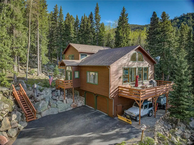 Immaculate mountain view home. Pride of ownership abounds with meticulous maintenance & careful attention to detail. Nothing to do except move in! Private paved driveway welcomes you to this peaceful turnkey property complete with 2 seasonal streams. Vaulted 2 story ceilings on the open concept main floor with ample windows make this floor plan light & bright. The beautiful spacious open kitchen features painted cabinets, granite counters, large pantry & counter seating. The adjoining dining room with wood stove flows seamlessly into the living room with to bring in the spectacular views. Immerse yourself in the Colorado mountain lifestyle on the large wrap around gated deck while enjoying the fantastic mountain views, happy hummingbirds & abundant wildlife. The open floorplan offers the perfect flow for entertaining family & friends. The main floor offers 2 bedrooms, full bath with upgr...