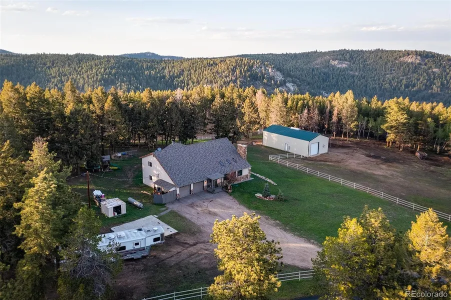 Welcome to your spectacular country retreat nestled within a commanding mountain backdrop in the heart of desirable Conifer. This wonderful 19-acre horse ranch with a paved drive, 2-car garage and agricultural well occupies a prime corner lot and offers picturesque grounds brimming with tall trees for ultra-privacy. On the rare property is a beautiful 4,000+ sq ft, 4 bedroom 3 bathroom home as well as a 40'x60', 60'x30' concrete floor with two 14' doors (great for drive-through with a horse trailer or RV), 5 indoor horse stalls, a barn with hayloft, and large 260'x160' w riding arena for roping or hunter/jumper. A generous deck affords a peaceful place to relax and entertain, enhanced by scenic views of nature and the outdoor riding area. The gracious 2-story residence is fire mitigated, bathed in natural light and finely appointed, featuring hardwood floors, 2 wood-burning fireplaces, and modern finishes throughout. Among the many other special elements is a large sky-lit vaulted great room; spacious eat-in kitchen with skylights, 2 islands, granite counters and pasture views; an office with built-in desk/cabinets and sliding glass door to the deck; tranquil master suite with a balcony and updated spa bath with a soothing soaking tub; large secondary bedrooms; an updated upstairs hall bath; full laundry room with cabinetry; and generous finished basement with recreation room further extending the comfort. Dream no more, your oasis awaits!