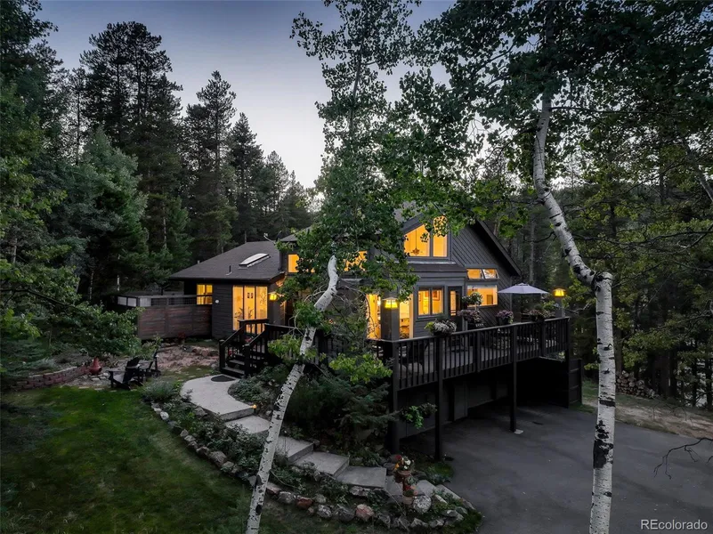 Nestled in the lovely Green Valley Ranch neighborhood of Conifer, CO, this tranquil and private oasis is the perfect setting for mountain meets city living. This pristine 3 bedroom, 2 bath home sits on over an acre with a south facing beautifully landscaped entrance. The grounds are a lush forest of aspen, pine and spruce. The vaulted ceilings and tons of windows on the main level make this open floor plan light and bright. The kitchen boasts stunning brand new Azurite slab granite counters, providing a perfect space to prepare your favorite meals and entertain guests adding to the beauty of this home. The living room showcases a cozy wood burning stove and new tile. A wall of windows in the dining area opens to the kitchen featuring newer vinyl wood flooring throughout. The open floor plan has an easy flow that leads onto the wrap around deck where you'll enjoy the surrounding mountain scenery while entertaining with family and friends. The primary bedroom is spacious with a walk in closet and an inviting hot tub just steps away on the private patio. The en suite bath features a gorgeous new marble floor, new granite counter and vanity. Two additional bedrooms are located on the main level as well as a second full updated bath. The lower level is an additional area adding ample space when gathering with loved ones for relaxing and unwinding, a laundry room area, storage room and closets for additional storage. A propane Rinnai and double pane windows help make this an energy efficient home. You'll love the new paved driveway and the attached finished 2 car garage. Plenty of parking space for your RV or camper. Close in location to Hwy 285 this home provides ultimate convenience and accessibility whether you're commuting to work, working from home, or enjoying a weekend getaway. Top ranked schools, trails, lakes and ski resorts are all an easy drive. Immerse yourself in the mountain lifestyle and welcome home to your perfect mountain retreat!!!