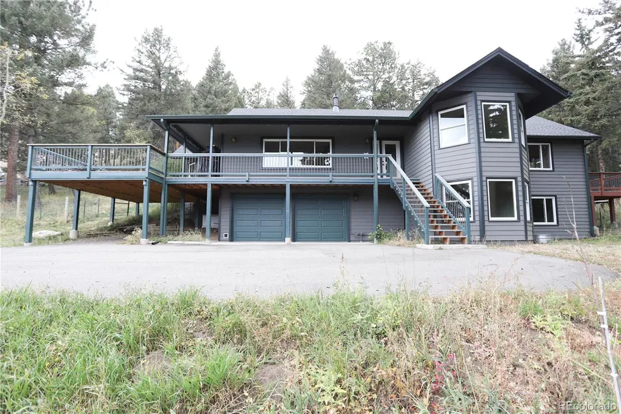 Your dream mountain home is ready and waiting for you! Completely remodeled and updated this spacious home has it all. New flooring, brand new roof and gutters, new exterior paint 2022, repaved driveway in 2021, 5 bedrooms and 3 baths...there is room for everyone. Wonderfully nestled just off 285 this home has fantastic southern exposure, lovely views of the valley and a water retention pond. Beautiful beetle kill trim throughout, a lovely fireplace that is also a programmable heat source will keep you cozy. A completely remodeled and updated, open kitchen has roll out cabinetry, Cafe appliances and a copper farm sink just waits for your culinary delights. Vaulted ceilings and fantastic light make this home airy and bright, also all new light fixtures with LED lights. Languish on the southern deck or enjoy quiet time on the north deck, there is a wired space for a hot tub and a giant(80X15) concrete patio sits on the west side of the home. Lovely primary suite has a lovely soaker tub, vaulted ceiling and a private deck that accesses the hot tub area. This home features some woderful options for heating, electric radiant in the ceiling, the programmable fireplace in the great room and a wall heater for the basement allow you to customize your home heating to your preferences, solar panels are leased and keep your electric bills low, propane tank is leased and filled on an as needed basis, automatic generator will kick in should the it be needed. Fantastic internet speeds of 80meg round out this lovely home. 2 small structures could be for chickens, goats or other small animals.