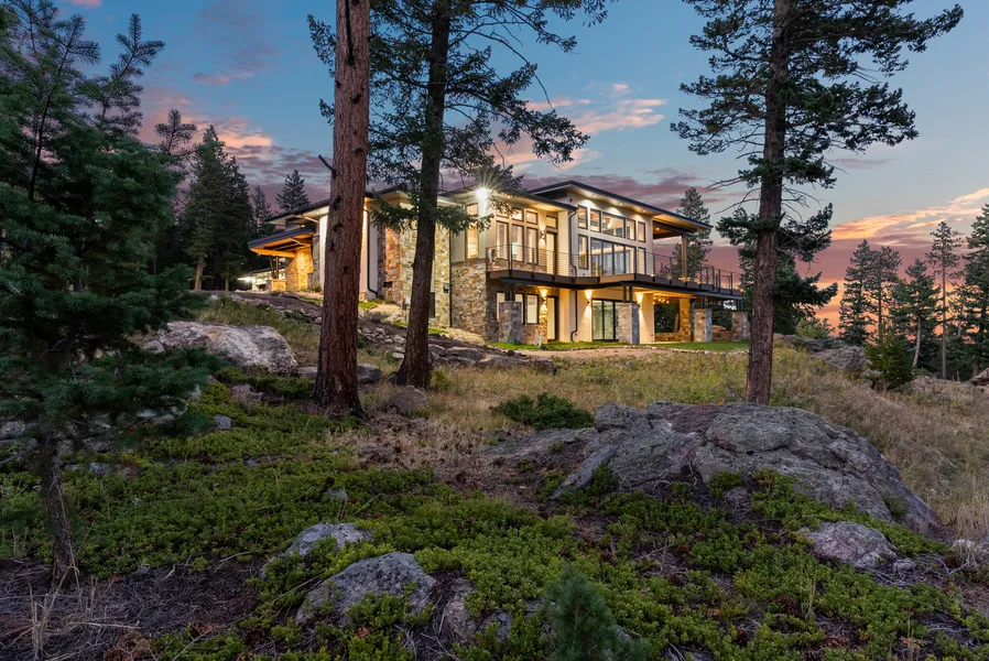 Nestled on 10 private acres, this stunning modern home perfectly marries contemporary design with the natural beauty of Evergreen. Situated at the top of a private country road this newer construction features an open floor plan, inviting abundant natural light and creating a warm, welcoming atmosphere. As you enter, the expansive great room captivates with its impressive 20-foot wood ceilings, elegant I-beams, and automated accent lighting. Large windows and sliding glass doors open to the spacious deck and showcase breathtaking mountain views, while a striking gas fireplace with custom stonework and rolled steel surround serves as a cozy focal point. The gourmet kitchen is a chef’s dream, highlighted by a magnificent 14-foot Quartzite Island with a waterfall edge, Thermador appliances, and custom Plato cabinetry and offers the ideal space for entertaining. The luxurious main floor primary suite features a spa-like en-suite bathroom with dual Quartzite vanities and custom lighting, a soaking tub, and a glass-enclosed shower. With 5 additional bedrooms throughout the home, to include a private In-Law suite, and 2 offices, this exceptional home offers space to suite all needs. The walkout lower level enhances the home's entertaining potential. This space features a spacious entertaining area complete with an oversized 12-foot bar topped with a stunning live edge butcher block. While a remarkable 1,400 square foot covered patio area extends the living space outdoors, perfect for enjoying the surrounding nature. With energy-efficient features, smart home technology, and impeccable craftsmanship, 1082 W Meadow Drive stands as a true sanctuary, offering the perfect blend of luxury and comfort in a breathtaking setting.