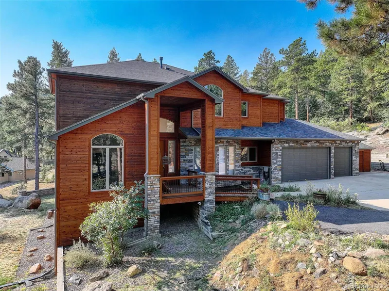 UPDATED PHOTOS COMING EARLY FEBRUARY. Sellers have been busy - many recent wonderful updates to the kitchen, flooring (new carpeting), lighting, front entry, (new photos coming). The intricate mosaic tile design in the foyer and grand curved staircase make an immediate impression. Adjacent to the main entrance, an office with French doors offers a quiet well-appointed workspace. The formal dining room features a decorative inlay wood floor and is conveniently located near the kitchen and powder room. The chefs kitchen is a culinary hub, featuring cherry cabinets, luxurious slab granite countertops, Wolf double ovens, microwave, cooktop & Asko dishwasher and spacious walk-in pantry. The kitchen flows into a casual dining area with easy access to the covered entertainment deck for year-round enjoyment and then just steps to the Hot Tub. The great room has floor-to-ceiling windows and see-through fireplace opens to a more casual living room. Ascend the stairs to the upper level primary suite, a sanctuary with its own gas fireplace, lighted art niches and private balcony. The primary bathroom is spa-like with travertine tile floors, marble countertops, marble shower and jetted tub. The thoughtful design ensures privacy for three more upper-floor bedrooms with either ensuite or dual bathrooms. Everyone can spread out in the lower level walkout. This level features high ceilings and includes a guest bedroom with adjacent full bath. An office could be art studio, or exercise room with French doors. A huge open room is perfect for entertainment plans. Walk out to find a concrete covered patio with decorative retaining wall. The finished attached three car oversized garage features epoxy floor coating and storage galore. Also a large separate storage shed. Situated on 4 useable acres with pines, rock outcroppings and a large meadow, this property provides great recreational opportunities! Just 5 minutes to 285 and 10 minutes to C-470 making for an easy commute.