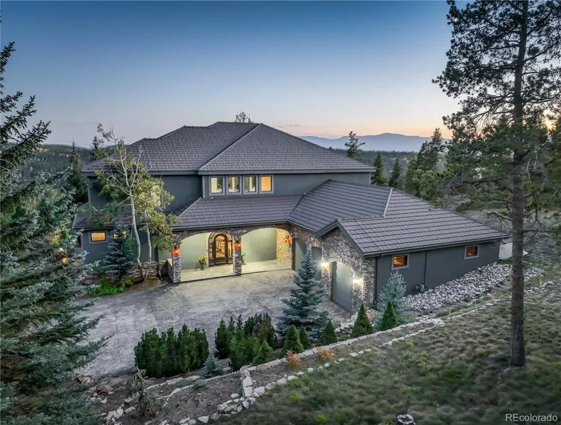 Modern mountain masterpiece! This luxurious, contemporary estate blends elegance, design & functionality in the exclusive Belle Meade executive community. Spanning over 10-acres, this 4 bed, 6 bath, 6,346 sq ft home boasts spectacular views of Pikes Peak, Riley Peak & more. No expense was spared in the gorgeous renovations of the kitchen, primary bath & primary closet. The open-concept layout is highlighted by soaring ceilings & abundant windows, allowing ample natural light & showcasing the breathtaking mountain views. The gourmet kitchen is a chef's dream, equipped with top-tier appliances, custom cabinetry, quartz countertops & stunning backsplash. Additional amenities include ice maker, pantry, beverage station with cappuccino machine & custom seating island. The living room, with vaulted ceilings & striking custom copper fireplace wall, seamlessly connects to a covered back patio, extending the living space to the outdoors. The main floor primary suite has stunning views, gas fireplace & patio access. Enjoy the amazing spa-like ensuite bathroom oasis offering a freestanding jetted tub, dual custom steam shower with lighting & music, large infrared sauna, bidet toilet & urinal. The oversized walk-in closet is reminiscent of a high-end boutique, with lighted showcase area, dual benches & stunning chandelier. Upstairs, you'll find a large flex space loft with wet bar & gas fireplace, 3 ensuite bedrooms, a versatile bonus room for gym, theater, office or 5th bedroom & powder room. The outdoor entertaining options are exceptional, with custom cooking pergola featuring a gas grill, smoker & a large, covered patio for unwinding & enjoying the breathtaking mountain views. Wired for hot tub. The oversized 3-car garage with EV charger, cabinets & workbench offers plenty of room for mountain toys. Top rated schools! Located just off 285, this property offers the ideal balance of private luxury mountain living close to convenient amenities. See video & virtual tour.