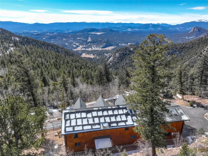 Luxury log home with panoramic mountain views! Sunny, south facing, paved driveway with beautiful aspen trees welcomes you to this immaculate 5 bed, 4 bath, 4,966 sq ft home on 2+ acres with picturesque views of Mt Rosalie, Lions Head, Mt Blue Sky & more. Mountain charm surrounds you with custom design features include wood beams, window seating, corrugated metal walls & stained concrete floors. The vaulted 2 story ceilings with ample windows & skylights make this open floor plan light & bright. The family room features a stately floor-to-ceiling stacked stone wood fireplace, rustic mantle, built-in shelving & wall of windows to soak in the views. The spacious kitchen with island, granite counters, custom backsplash & SS appliances is well configured & opens to the dining room for easy living & entertaining. Enjoy magnificent mountain views from the LARGE upper deck accessible from 3 rooms. The main floor primary ensuite features stack stone gas fireplace, walk-in closet & 5-piece bath with jetted tub. The upper-level features 2 large bedrooms, full bath, loft & separate game room wing with 1/2 bath, wet bar & stairs to garage. The lower walk-out basement level features 2 bedrooms (non-conforming), bath, 2 storage rooms & versatile great room with wet bar. Perfect layout for multi-generational living. Immerse yourself in the Colorado lifestyle while relaxing in the saltwater hot tub on the large, covered patio while watching the abundant wildlife. Pride of ownership with thoughtful updates & meticulous maintenance. New stain/seal & paint (2024), newer class 4 roof (2022), newer solar panels (2023), radon system, well pump, mitigation & whole house generator. Upper acreage offers a level area for garage, workshop or RV storage. This property is a serene, luxury mountain resort! Close to 285 for convenience & accessibility. County maintained roads, school bus route & top ranked schools. Welcome to your Colorado dream home! *** See virtual tour with floorplan.