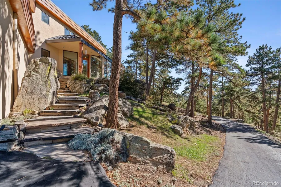 Set against ancient rock formations and surrounded by 10.46 private acres, this Evergreen retreat is both a sanctuary and a statement. With 3,353 square feet of light-filled living, the home offers spaces designed for connection and calm-sun-soaked mornings in the solarium, evenings by the fire in the formal living room, and dinners that linger into the sunset. Five distinct outdoor living areas, including over 1,500 square feet of decking, frame panoramic mountain views and bring the outdoors into daily life. Inside, a sunroom, owner's suite, and flexible spaces capture both the drama and serenity of the setting. Thoughtful enhancements ensure ease of living, from radiant heat and water purification to completed fire mitigation. The three-car garage, garden-level living spaces, and private entry for gear or guests complete the property's effortless balance of beauty and function. Here, privacy meets convenience-just minutes from Evergreen and under 45 minutes to Denver