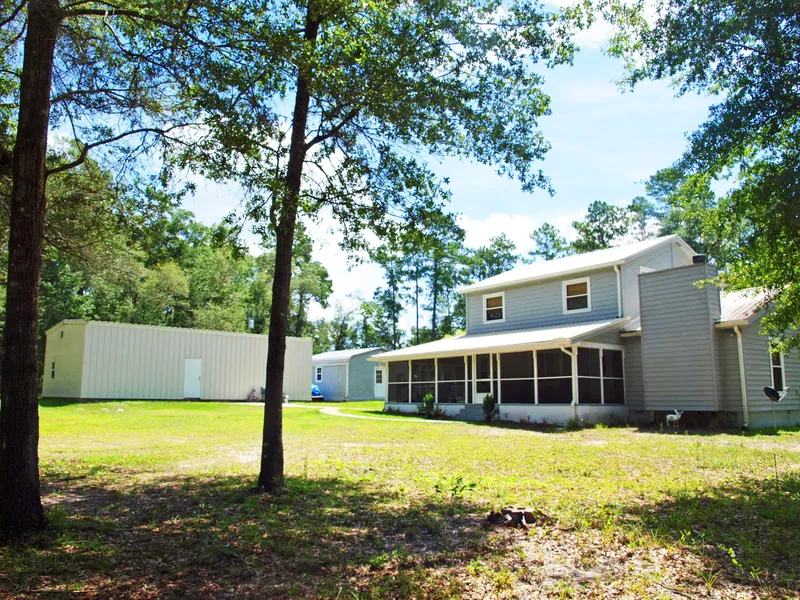 NORTH FLORIDA 20 ACRE MINI-FARM, COUNTRY HOME, POOL, BARNS. This attractive, well-kept 20.5 acre farm is located on a paved road just 12 minutes east of a large Tallahassee office complex and shopping. The comfortable 2016 square foot country home with wrap-around screened porches is privately located at the rear of the property. The wood floors, fireplace, and many custom features added by the owner give it a homey feel. There's lots of downstairs space with three upstairs bedrooms. The property consists of about seven acres in pasture and old irrigated nursery beds (with a blueberry planting), about 9 acres in dense woods, and about 4 acres that include a pond, the residence, a covered pool, and two barns. The large metal barn houses two cars in one section and a large shop in another section. The smaller wood-framed barn is big enough for a car but currently houses lawn equipment. Though there are two wells on the property, the home is served by a public water system. No HOA. No deed restrictions.