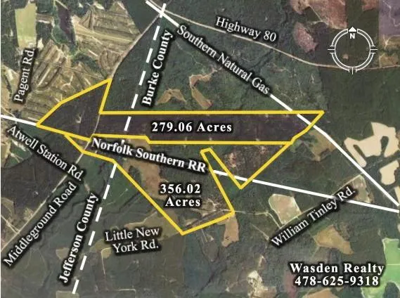 This tract is situated in two adjoining counties Jefferson and Burke with road frontage on both sides of Middleground Road in Jefferson County and both sides of Little New York Road in Burke County. The property offers a well maintained interior road system which travels through large heavy hardwood, planted pines and a few overgrown farm fields. The proprety has been used as a private hunting preserve for the last ten years and boasts a well maintained deer herd, an abundant turkey population and numerous quail coveys which have been released by the owner. The mature hardwood timber could provide an immediate cash flow if needed and all of the deerstands overlooking the planted wildlife food plots are included making this tract a perfect turm key recreational hunting, timber or investment tract.