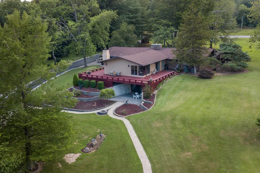 Beautiful landscaping, rear wrap around deck that provides great outdoor entertaining and paved walkway to lake and boat dock. Detach storage building and 3 car garage w/rear overhead door for extra storage needs. Enjoy the good life with 3 acres and lake nestled in the trees with privacy. Call today for private showing.