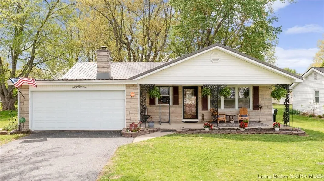 WELCOME HOME to this Beautiful single-story home in a quiet Madison neighborhood near Clifty Falls! This 3-bedroom home offers an additional non-conforming bedroom/office, 1.5 remodeled baths, and an oversized family room with built-ins, electric fireplace, laminate flooring, and French doors. Enjoy hardwood floors in the bedrooms and dining room, plus a spacious eat-in kitchen with pantry and included appliances. Features include a metal roof (2012), central air, heat pump, 2-car insulated garage, full attic, covered front porch, fenced backyard with deck and fire pit, and a shed. The security system is connected to all windows, doors, and the main smoke alarm (buyer activation required). Other updates include a 2-year-old water heater, updated plumbing, moisture barrier with sump pump, and double-paned windows. Convenient to shopping, dining, and nature, this home blends comfort, charm...