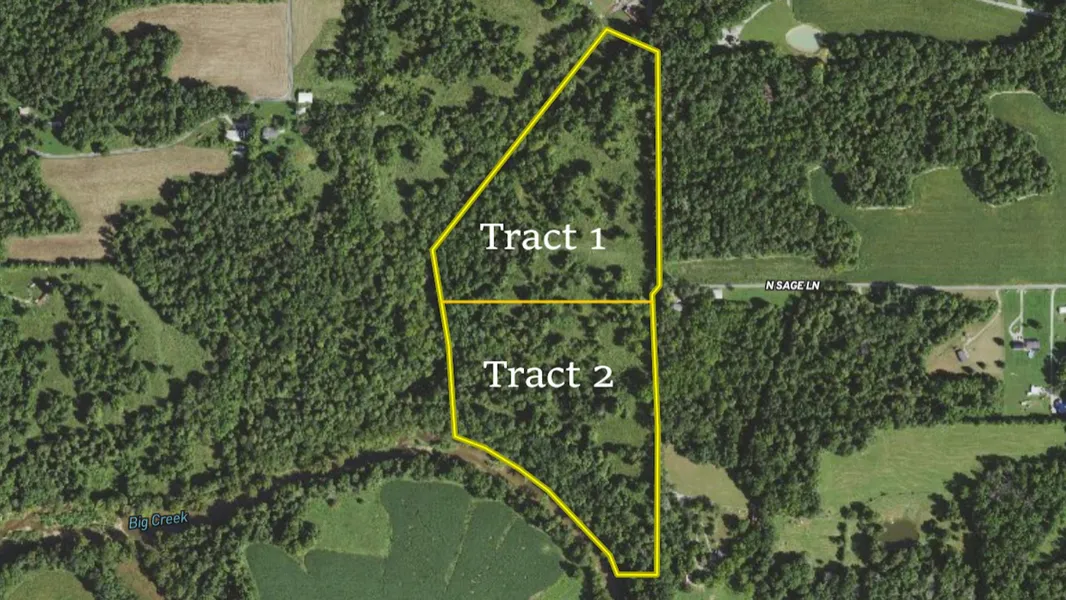Homes on acreage are a popular topic in the market and this parcel will be very popular for exactly that. This +/- parcel is offered whole or as 2 tracts, each with its own convenient cleared hilltop. Located at the end of a gravel road, privacy and seclusion will be key characteristics amongst the other attributes. There are trails throughout the property and diverse wildlife habitat. This area is known for great deer hunting and this parcel is no exception. The owner can attest to the great deer genetics and has the trophies and photos to back it up. Tract 1 would offer a beautiful view facing north, overlooking mowed grass fields. Tract 2 borders Big Creek and has awesome views of the water and ag fields below. Utilities are conveniently nearby, making development hassle-free. This property is an opportunity to escape city life and embrace tranquility. Contact us today to tour this exceptional land and turn your dream into reality.