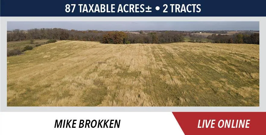The Brokken Farm is located in Sections 7 & 8, Round Prairie Township, Jefferson County, IA. (3 miles southwest of Lockridge or 8 miles southeast of Fairfield, IA) From Lockridge, IA go west 3 miles to Tamarack Ave., turn left or south and proceed 1 mile to Teal Ave. and continue 1 miles to 239th St. Turn right or west and go a short distance to the farm. (Be watching for presale directional signs).