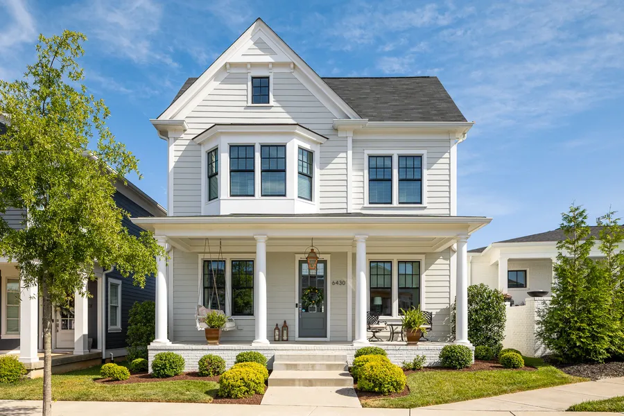 Nestled within the vibrant Norton Commons community, this custom-built two-story is the opportunity to own a like-new home without waiting on the construction, allowing homeowners to immediately begin enjoying the neighborhood's plazas, parks, pools, and recreational amenities. When not exploring the local restaurants or enjoying a concert at the lakeside amphitheater, the home's picturesque front porch is the perfect spot to relax and unwind before heading inside. The open floor plan of the first floor welcomes guests into the entryway of the home, flanked by an elegant dining room with bright windows to the left, and handsome home office with built-ins and closet to the right, accented by custom herringbone sliding doors. The first floor continues into the spacious living room and gourmet eat-in kitchen, anchored by French doors opening to the covered porch and patio. The living room offers stylish built-in bookshelves, marbled fireplace, and ample natural light throughout. Perfect for entertaining, the living room opens to the eat-in kitchen with oversize island, floor-to-ceiling cabinetry, designer pendant lighting, stainless steel appliances, walk-in pantry, and convenient dry bar with beverage cooler adjoining the dining room. The main level is complete with a powder room and convenient drop off station at the home's rear entrance leading to the two-car garage. The second floor features a welcoming lofted area with built-in window seat and cozy bookshelves, perfect for a study space or play area. The impressive primary suite offers bright windows, large walk-in closet, and luxurious primary bath with dual vanities and oversize shower. Two sizable bedrooms, shared full bath, and spacious laundry room complete the second floor. The lower level features over 1,200 unfinished square feet to satisfy the most demanding storage needs, or provide the option for additional finished space at a later time. The low-maintenance lifestyle continues outside with a second covered porch, gracious entertaining patio, and turf grass, perfect for grilling and entertaining. Completely move-in ready and picture-perfect in every way, this home is not to be missed.