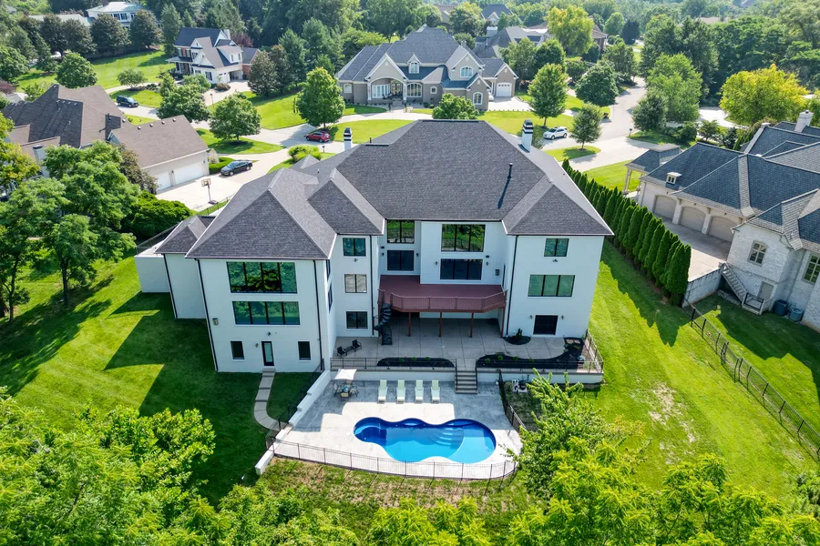 Owners are motivated. Elegantly situated within the serene confines of the Elmcroft neighborhood, this distinguished residence epitomizes luxury living on a sprawling 1.35-acre wooded lot. With a newly installed roof 6/2024, freshly painted exterior trim 7/2024 this home is a show stopper. Upon arrival, a grand two-story entryway sets the stage, flanked by a sophisticated first-floor study boasting custom built-ins and abundant natural light. Designed with a seamless blend of sophistication and functionality, this home spans over 14,731 square feet, boasting an expansive open floor plan that effortlessly transitions between living spaces and offers captivating views of the picturesque backyard through floor-to-ceiling windows. The impressive great room flows into the formal dining area, complete with a well-appointed wet bar, ideal A culinary masterpiece awaits in the gourmet kitchen, showcasing three expansive islands, granite countertops, and top-of-the-line GE Monogram appliances, including dual dishwashers, a six-burner gas stove, and double ovens with a custom commercial hood. Adjacent to the kitchen, the inviting living room features a cozy gas fireplace and a captivating spiral staircase, adding both functionality and architectural charm. Retreat to the expansive primary suite on the main level, offering a serene sitting area, gas fireplace, and private access to the deck overlooking the tranquil backyard oasis. The ensuite bathroom boasts double vanities, an oversized shower, and a luxurious whirlpool tub, complemented by a meticulously designed walk-in closet adorned with custom shelving and cedar plank accents. Ascending to the second level reveals three generously sized bedrooms, each accompanied by a full bathroom and walk-in closet, as well as an additional sitting room offering panoramic views of the lush surroundings. Convenience is paramount, with dual laundry facilities provided on both levels. The finished walkout lower level extends the homes entertainment possibilities, featuring hardwood floors, a family room, a recreation area with gas fireplace, and a pre-plumbed space for a wet bar. Two additional bedrooms and a full bathroom provide ample accommodations, with the latter designed for effortless access to the outdoor pool area. A discreet safe area adds an extra layer of security and functionality to the lower level. Outdoor entertaining is elevated on the expansive wood deck, complemented by a spiral staircase leading to the lower patio. A four- car garage with basement access adds both convenience and practicality to this exceptional residence. Recent updates include a comprehensive interior and exterior repaint in 2023, addition of a new deck, and expansion of the second floor by 875 square feet complete with a new furnace and A/C unit. Further enhancements include expanded living space in the walkout lower level, featuring a recreation room, workout area, and a new kitchen/bar facility. A thoughtfully integrated in-ground pool, expansive concrete patio, and fencing complete the outdoor oasis, ensuring a lifestyle of unparalleled luxury and comfort. Surround Sound with Control 4, controlled by the phone. Newly installed elevator. Home appraised in 2024 for $2,760,000