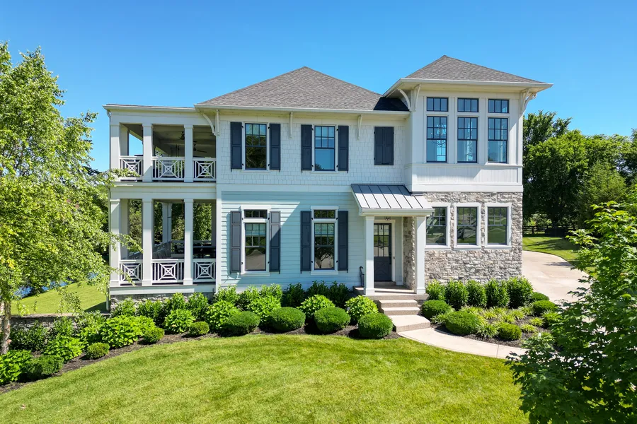 Discover unparalleled elegance in this former award-winning Homearama home from 2015, ideally situated in the coveted Spring Farm Lake community. Offering stunning lake views throughout, this exquisite Stonecroft-built coastal-style residence boasts over 7,451 sq ft of customized upgrades. From the moment you enter, you'll be greeted by classic charm with modern luxury, including wide plank hardwood floors, custom transoms, shiplap walls, high ceilings, built-ins, surround sound, and a desirable open floor plan. Enjoy three-season entertaining and everyday living alike on the large, covered porches on all three levels of the home. The first floor showcases a gourmet kitchen equipped with Thermador appliances, a large center island, built-in icemaker, walk-in pantry, office nook, and custom recessed cabinetry. The light-filled great room, featuring a masonry fireplace, flows seamlessly into the spacious formal dining area. Completing the first floor is a mud room, laundry room, a half bath, and an owner's suite with a spa-like bathroom and large custom closet. Upstairs, you'll find three bedrooms, each with generous closet space and en-suite baths, and a second family room. The lower level offers all the bells and whistles sought after by today's homeowners: expansive ceilings, an inviting family room, home gym, large office space with custom built-ins, bunk room, and a full bathroom with steam shower, all complemented by ample storage. Additional highlights include a 3.5-car garage, full home generator, irrigation system, Phantom screens, and home security system. Don't miss this opportunity to own this remarkable property, where custom construction, thoughtful design, and impeccable craftsmanship unite to create an extraordinary living experience.