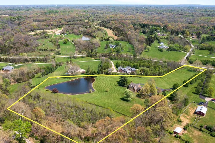 Experience timeless charm and serene seclusion in this classic and stately Williamsburg-style estate, nestled on 15 private acres with its own tranquil pond. Surrounded by natural beauty and abundant wildlife, this 4-bedroom, 4.5 bath home offers a peaceful retreat with all the comforts of refined living. Built in 1989, this home is designed with today's desired conveniences such as geothermal heating and cooling, with nods to historic elegance such as tall ceilings, gorgeous wide plank hardwood flooring, corner fireplaces, and a large cozy hearth room open to the kitchen. The deep front porch spanning the entire front of the home ushers in calm and quietude along with comforting breezes, the perfect spot to start or end your day. The kitchen features all the modern conveniences such as granite, paneled appliances and a prep island while being open to the hearth room complete with a large fireplace as the focal feature and views of the grounds and pond. The sunroom, in the rear of the home, offers yet another picturesque view of the pond and the remaining property, perfect for bird and deer watching. You have options for a primary suite, one on the main floor and one upstairs. Each spacious bedroom with en-suite bathrooms offers its own privacy along with cozy nooks for gazing out onto this extraordinary property. The first floor laundry and mud room off the 3-car spacious garage complete the home. The owners have updated many of the systems and property over the last few years including the addition of the incredible front porch, windows, roof, copper gutters, tuck pointing, garage doors, updated electrical panel, and repaved and recently sealed driveway, just to name a few. This stunning and gracious home offers the best of both worlds - peaceful solitude while being mere minutes from grocery, shops and restaurants. It offers ease and convenience to the interstates, still close to racing, bourbon events, and less than 40 minutes to Frankfort and one hour to Lexington. Don't miss this once in a lifetime opportunity.