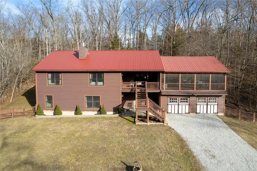 Secluded home on five acres. Gourmet kitchen with antique apothecary island, handmade butcher block top, and new refrigerator (2022). Luxury master suite with jet tub and 19th century French doors. Open living room with fireplace. Finished walk-out lower level with big laundry room and gym. Pine walls and ceilings. Oversized screened porch with ceiling fan. Vaulted ceilings. Two-car garage. Sheds. Peaceful backyard with fence and deck. Scenic year-round creek running through the property. New metal roof (2017). New septic pump (2024). New water heater (2021). New gutters (2023). New exterior paint (2023). County maintained dead-end road. Circle driveway. Not in a flood plain.