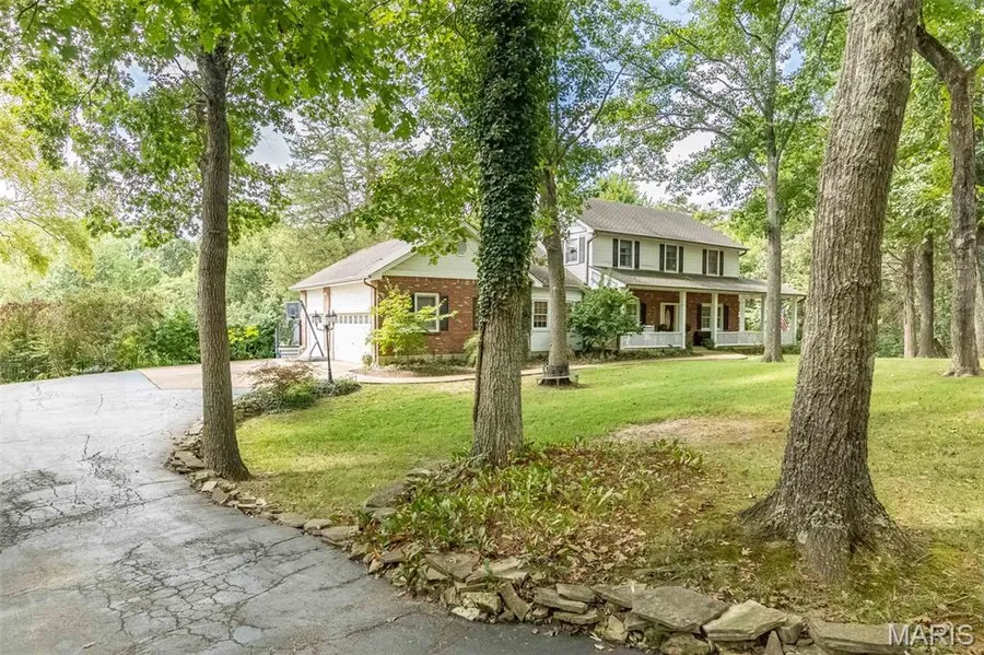 If the suburbs are a little too crowded for you, consider this 4000+ SF 2 story home on just under 2 acres, on a culdesac, with an inground pool! The wrap around front porch invites you to come and "sit a spell" under tall trees. Leaded glass front door opens to a foyer featuring wainscoting and crown molding, hardwood flooring spans dining room, living room which opens to the family room, perfect for holiday celebrations or curling up to read a good book with a cozy fire in the fireplace, natural light filtering in through the bay window. The country kitchen is the heart of this home, - tile floors, planning desk, pantry, solid surface counters, glass mullion cabinet fronts. Second bay window looks out over the deck. Main floor laundry and a convenient office off the kitchen and a very oversized 3 car side entry garage. Upstairs is a lovely primary suite with walk in closet, separate tub and shower, double vanity. The remaining 3 bedrooms share a hall bath with tub/shower combo and double vanity. Lower level walk out to the yard and inground pool. There's a big rec room with a walk behind bar, a play room, full bath, and lots of built in storage. The pool has a large deck, and there's still plenty of yard for gardening and play. Lakewood Hills includes 2 community lakes with a sand beach, swimming, a pavillion that is easily reserved for private use, and plenty of fishing to be enjoyed. Low Jefferson County taxes and Rockwood schools are a winning combination!