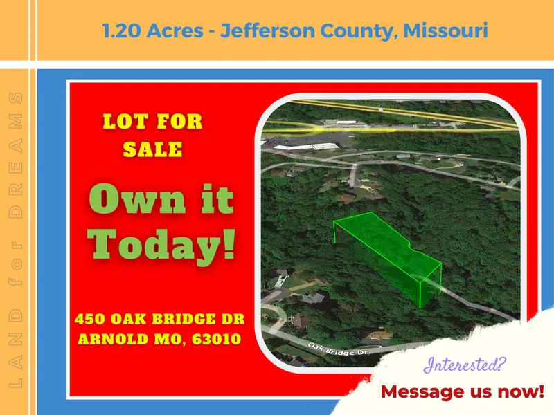 Research Parcel InformationFrom St Louis: Enter property address into your navigation, 450 Oak Bridge Dr, Arnold, MO 36010 and drive about 32 minutes to the property. OR, Take S Tucker Blvd south toward I-44 for about 1.7 miles. Continue straight onto Gravois Ave then becoming Old Rte 66 W. Continuing past Russell Blvd and just after the Jack-in-the-Box on the right, take the entrance on the left for I-55 S toward Memphis. Merge onto I-55 S and drive for 12 miles then use the right 2 lanes to take exit 195 for Butler Hill Rd for .2 mile keeping right at the fork to merge onto Butler Hill Rd. Continue on Butler Hill Rd for 1.3 miles to Griffin Rd and turn left. Drive .4 miles and turn Left onto MO-21 S/Tesson Ferry Rd. Continue for 4.3 miles then take the Old Route 21 exit toward Meramec Hts and continue about 1.7 miles on Old Route 21 to turn left onto E Rock Creek. Drive about .13 miles to take the first sharp left onto Hillcrest Rd/Maple Hillcrest Dr and continue .2 miles to Pine Tree Ct. Turn right then another immediate right onto Oak Bridge Dr. Drive .3 miles to turn left onto Woodcliff Ct very briefly, before turning left back onto Oak Bridge Dr. Continue to the end of the road, about .4 miles and the property is on the left. The worst part of the paved road is at about .2 miles then it improves to the property. The approximate center of the property is 38.43744, -90.45325.