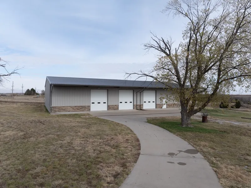 Just minutes from Fairbury, Nebraska, and only seven miles from the Kansas border, this exceptional property offers the perfect blend of comfort and utility on a spacious footprint. The 80x120 building boasts a 7,200-square-foot shop, complete with three 12x14 electric overhead doors, a convenient half bath, and cozy floor heating throughout. Attached to this incredible workspace is a 3,400-square-foot residence designed with accessibility and elegance in mind. Featuring four bedrooms, two and a half baths and an office, the residence includes 36-inch doors throughout and beautiful hickory cabinetry complemented by granite countertops. The home's stunning bar and fireplace are crafted from Arizona rock, adding unique character to the main living space. The luxurious primary suite includes patio access and a private bath with a Jacuzzi hot tub, offering a relaxing retreat. Upstairs, you'll find two additional bedrooms, a furnace room and an unfinished space, with convenient shop access for added functionality. Equipped with a wood stove and forced-air system alongside floor heating, this property provides warmth and efficiency year-round. Whether you're looking for a comfortable family residence, a workshop with all the amenities, or a unique blend of both, this property is a rare find in a prime location. Call Luke Wallace, Whitetail Properties, today for your private showing!