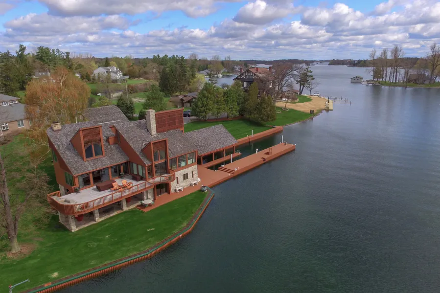 Blue Top originally one of George Boldt's pumphouses and used as a guest house in the St. Lawrence river area called Millionaire's Row. This highly contemporary home was designed by Al Cromarty a well known Kingston, Ontario architect. Sited beautifully on the waterfront with panoramic views of the St. lawrence river channel. this residence is memorable. The interior use of clerestory windows give the occupants views from every space. The amenities are too numerous to mention such as 3 floors of living areas, loft area, spacious decking and ground level outdoor fireplace and eating area, 2 crib docks with covered boat port and 74 foot outer dock. The condition is impeccable and the location is superb and walkable to the Thousand Island Club and Wellesley Island amenities.