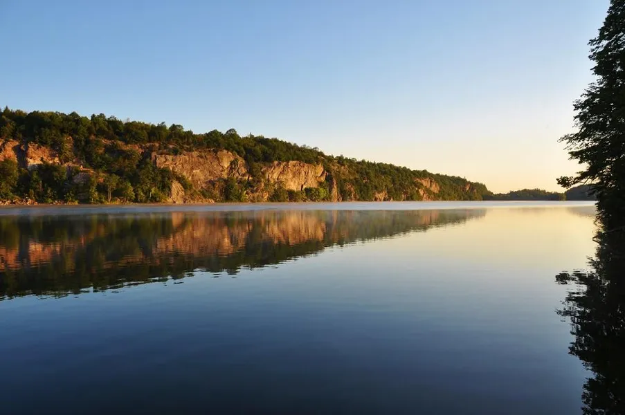 Enjoy 5 acres of woods and gentle terrain along an undiscovered glacial lake. Commanding waterfront views over very usable shorelines. See 1000's of feet of open water ending with 100+ foot shear granite cliffs located on the opposite side of this natural glacial lake. These amazing lakeside cliffs run over 1 mile long, and this rare and unique view is protected by over 1600 acres of state forests.