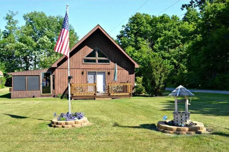 Good opportunity to enjoy the River without paying Waterfront prices. Front facing windows and large screened in patio gives you good views of the water. The chalet style has a 1st floor bed and bath, and was built by the seller, is well insulated and Town plows the road so it could be year round. There is also a large open loft area. The lot is large and level with a shed. Furnishing and appliances will stay. Added bonus is a camper hookup for electric/septic/water behind the house...this property is well priced.